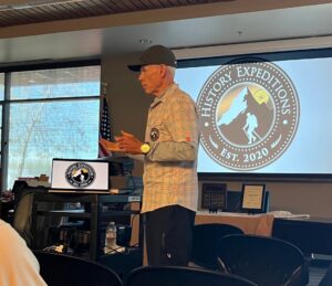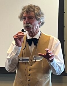Our program included the History Expeditions trio of Bob Crowley, Tim Twietmeyer and Hal Hall describing their next event, re-riding the route the six horsemen took after they split off from the Stephens-Townsend-Murphy Party near Donner Lake. After lunch we had a very enjoyable visit by Mark Twain, followed by Robert Keahey, who took a deep dive into the Hastings Cutoff.